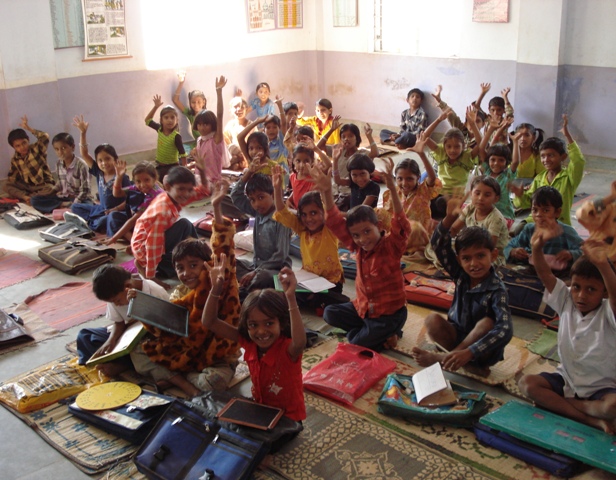 En Inde, ici dans l'État du Gujarat, la plupart des élèves du cours primaire portent un uniforme pour se rendre à l'école. Le jour où cette photo a été prise, ces enfants pouvaient s'habiller comme ils le souhaitaient à l'occasion de la journée spéciale hebdomadaire de l'école. Durant cette journée, chacun apporte ses idées pour améliorer le programme scolaire et s'implique dans la rénovation de l'école à travers des activités de jardinage, de peinture ou de broderie. Notre visite surprise en décembre 2006 en a sans doute distrait plus d'un...