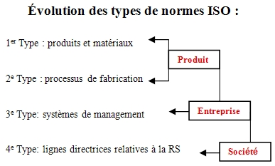 L’ambition de cette norme dépasse celle des précédentes, il s’agit avec l’ISO 26 000 d’aller encore plus loin que les normes précédentes en s’attaquant à la place de l’entreprise dans la société. Comme le montre le schéma précèdent on est ainsi passé du produit à l’entreprise et on passe aujourd’hui de l’entreprise à la société à partir du concept de « RSE ».